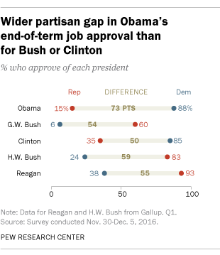 The latest Pew Research Center analysis of his legacy found that 81 percent of Democrats approve of Obama versus 14 percent of Republicans.