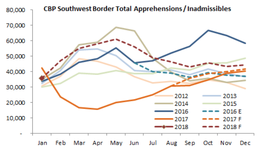 Our forecast for 2018 is driven by a few different factors. First, there is ordinary traffic. Second, there are those who deferred in 2017 who will cover over in 2018, most likely in the first half of the year. Third, the US economy is doing really well, and migrants always come for the jobs. Thus, economic conditions alone should inspire a robust response from migrants this year. Put it all together, and we should have a pretty strong year for illegal immigration in 2018, as I point out, probably the second highest after 2016 this decade.