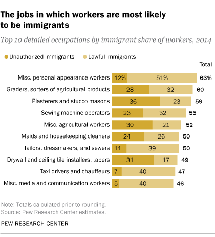 But in some specific jobs, immigrants do dominate, found Pew. “Immigrants account for about 60 percent of graders and sorters of agricultural products as well as plasterers and stucco masons, 55 percent of sewing machine operators, and about half of maids and housekeepers, tailors and dressmakers, and miscellaneous agricultural workers,” said Pew.