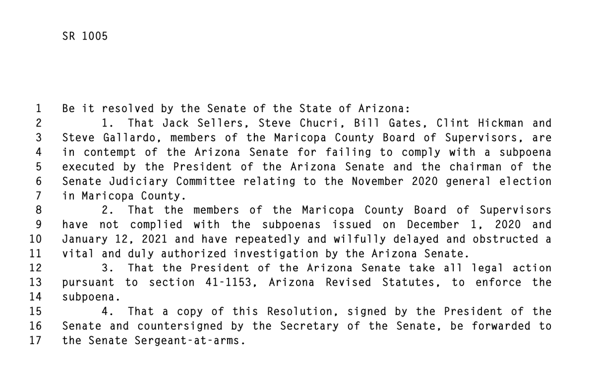 Here’s the contempt resolution, introduced by @FannKfann with the entire @AZSenateGOP caucus cosponsoring. Caucus discussion starts shortly. pic.twitter.com/oznlM9RjEh