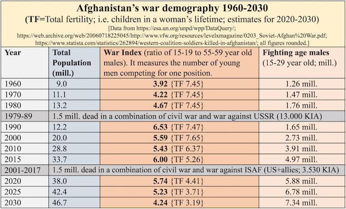 When American troops went into battle in 2001, Afghanistan’s war index was higher than ever. No matter how many smart bombs America and NATO dropped, Afghan forces grew stronger. The West was still not aware it was battling demographics. With an average of seven to eight children being born to each woman, Afghan insurgents could easily replace their losses.