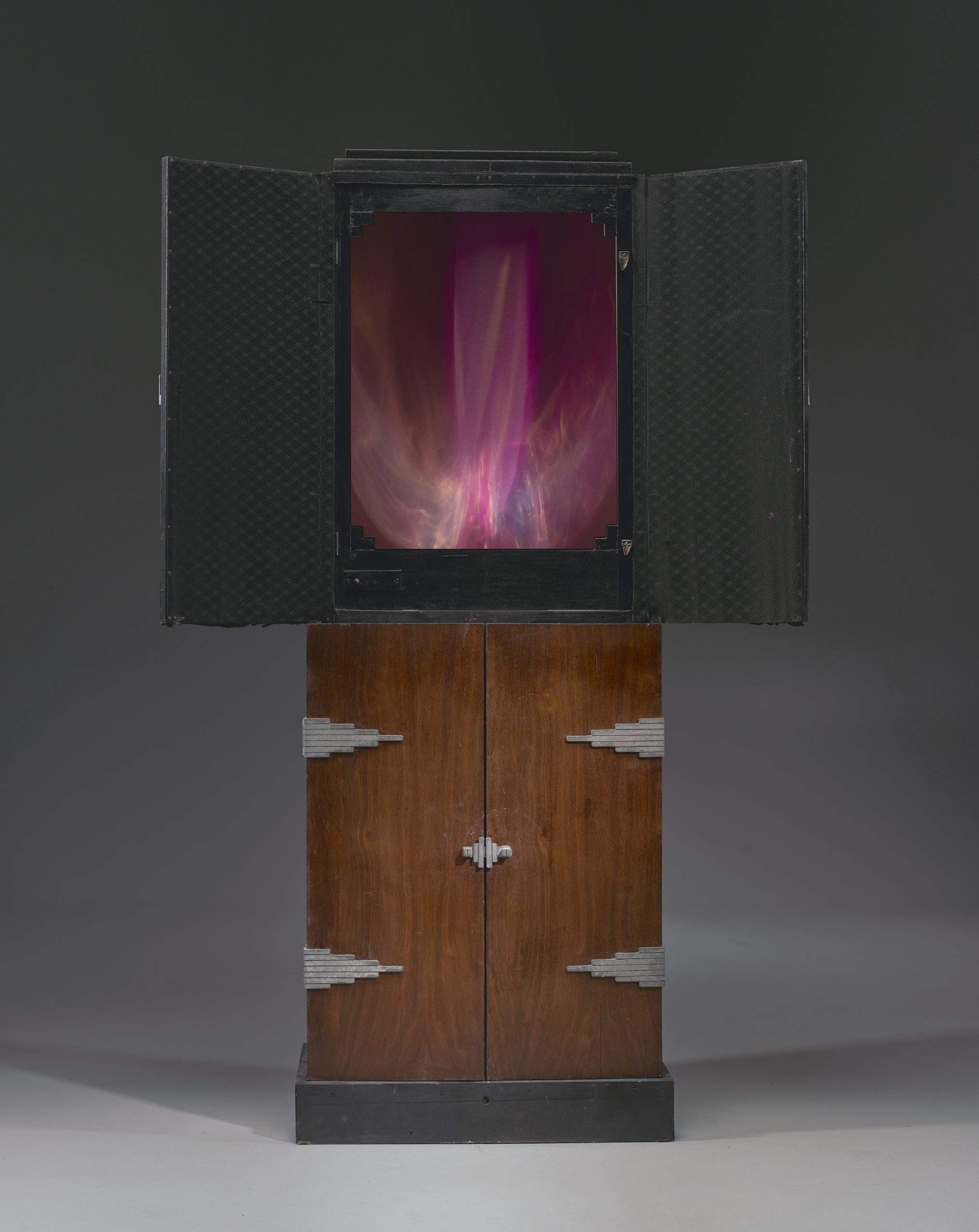 Lumia large and small—the “small” are wardrobe-shaped units in the Clavilux Junior series engineered to play hand-painted color records, the Clavilux being the light organ Wilfred devised to design and program lumia—demand our rapt attention. On one Clavilux Junior, an early model loaned from devoted collector Eugene Epstein, greyish brown blobs wobble for several minutes. “It looks like a sick lung,” one white-haired woman remarked to her smirking companion, during my first visit. She was right. But minutes later, they brightened and broke into reds, pinks oranges—and then deepened into rich blues as if the “lungs” had healed, burst into flame, and then gloriously drowned.