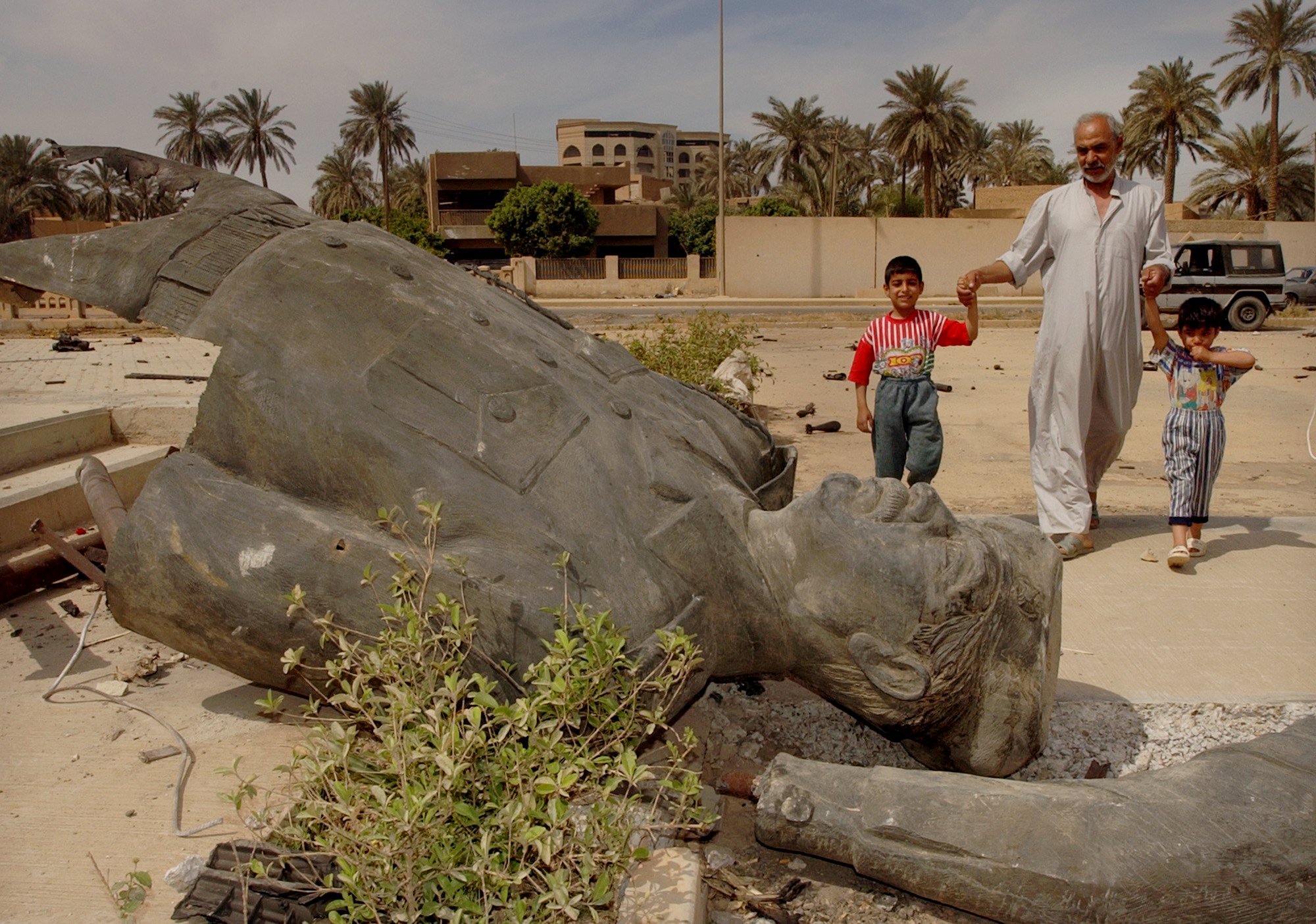 An Iraqi family walks past a toppled statue of the Iraqi leader Saddam Hussein in Baghdad. Memories of the Iraqi dictator’s ruthlessness have faded as Republicans have recast him as a bulwark of stability and resistance against Tehran and Islamic militancy. (AP Photo)