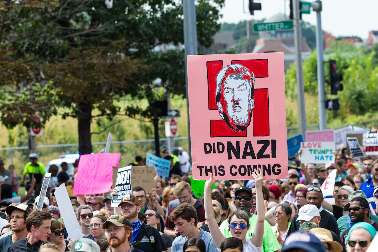 The further up the hill I went, the nicer people became. A well-heeled couple in “Bermuda” baseball caps who seemed to have strolled over from Beacon Hill stood next to a young man wearing a little black dress. Yet nearby, people carried large homemade placards with slogans like “MVP for KKK,” “Make Germany Prussia Again,” and “Super Callous Fragile Racist Sexist Nazi POTUS.” Others had scrawled phrases like “Fuck Nazis” on paper plates.