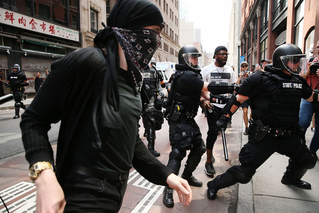 Protesters face off with riot police escorting conservative activists following a march in Boston against a planned ‘Free Speech Rally’ just one week after the violent ‘Unite the Right’ rally in Virginia left one woman dead and dozens more injured on August 19, 2017 in Boston, United States. Photo credit: Spencer Platt/Getty Images.