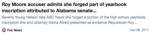 Fox News tweeted that, “Roy Moore accuser admits she forged part of yearbook inscription attributed to Alabama senate candidate.” (Fox later deleted the tweet without explanation.)