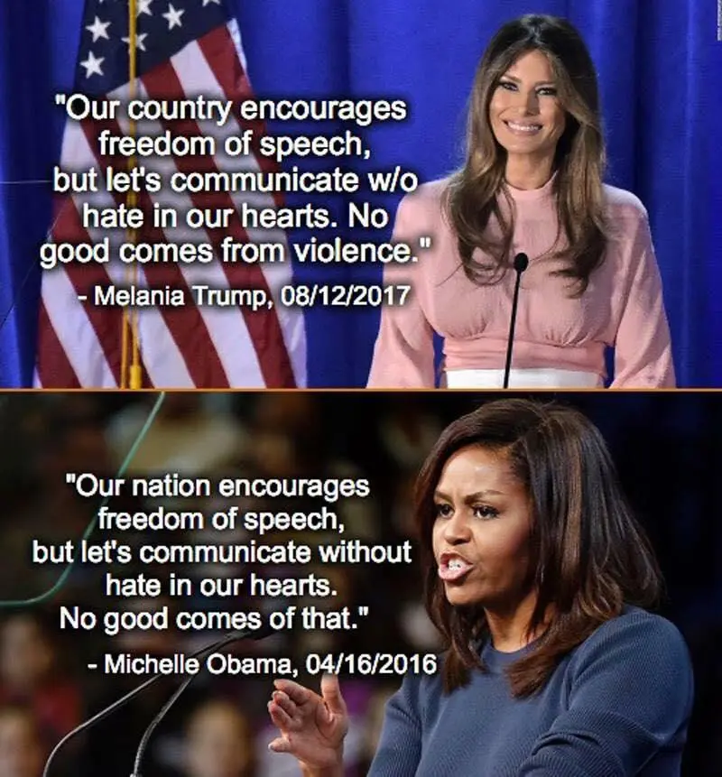 The meme plays off a 2016 incident in which the speech Melania Trump delivered at the Republican National Convention drew heavily on remarks made by Michelle Obama in 2008. A Trump campaign aide who wrote the speech for Mrs. Trump took responsibility for the uncredited words, saying that she took notes while Mrs. Trump read passages from Mrs. Obama’s earlier speech. Those notes were incorporated into the final draft of the speech without attribution. The aide offered to resign, but Donald Trump declined her offer.
