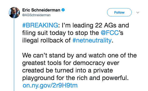 “We can’t stand by and watch one of the greatest tools for democracy ever created be turned into a private playground for the rich and powerful,” Schneiderman said in a statement posted to Twitter.
