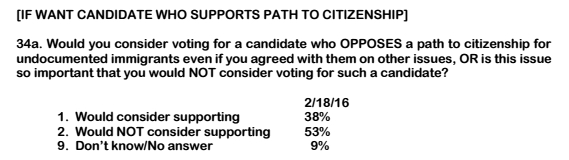 This figure doesn’t indicate that opposition to a path to citizenship is a disqualifying characteristic, given the number of Hispanics (51 percent) who say they’ll support a Democrat regardless. After all, as columnist Ruben Navarrette observes, the Hispanic vote is a complex topic.