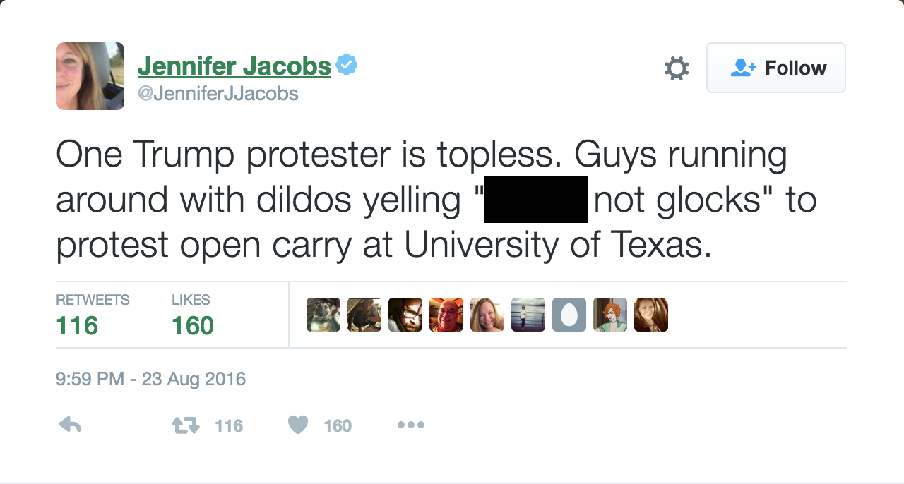 “The state of Texas has decided that it is not at all obnoxious to allow deadly concealed weapons in classrooms, however it DOES have strict rules about free sexual expression, to protect your innocence,” states a description for the event. “You would receive a citation for taking a DILDO to class before you would get in trouble for taking a gun to class.”