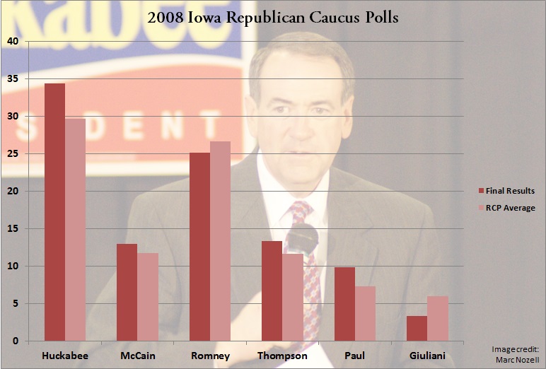 On the Republican side that year, it was a two-way race between Huckabee and Romney, with the former Arkansas governor holding a three-point edge on the eve of the caucus. But when the day came, Huckabee outperformed his final polling average by 4.7 points — and Romney underperformed his by 1.5.