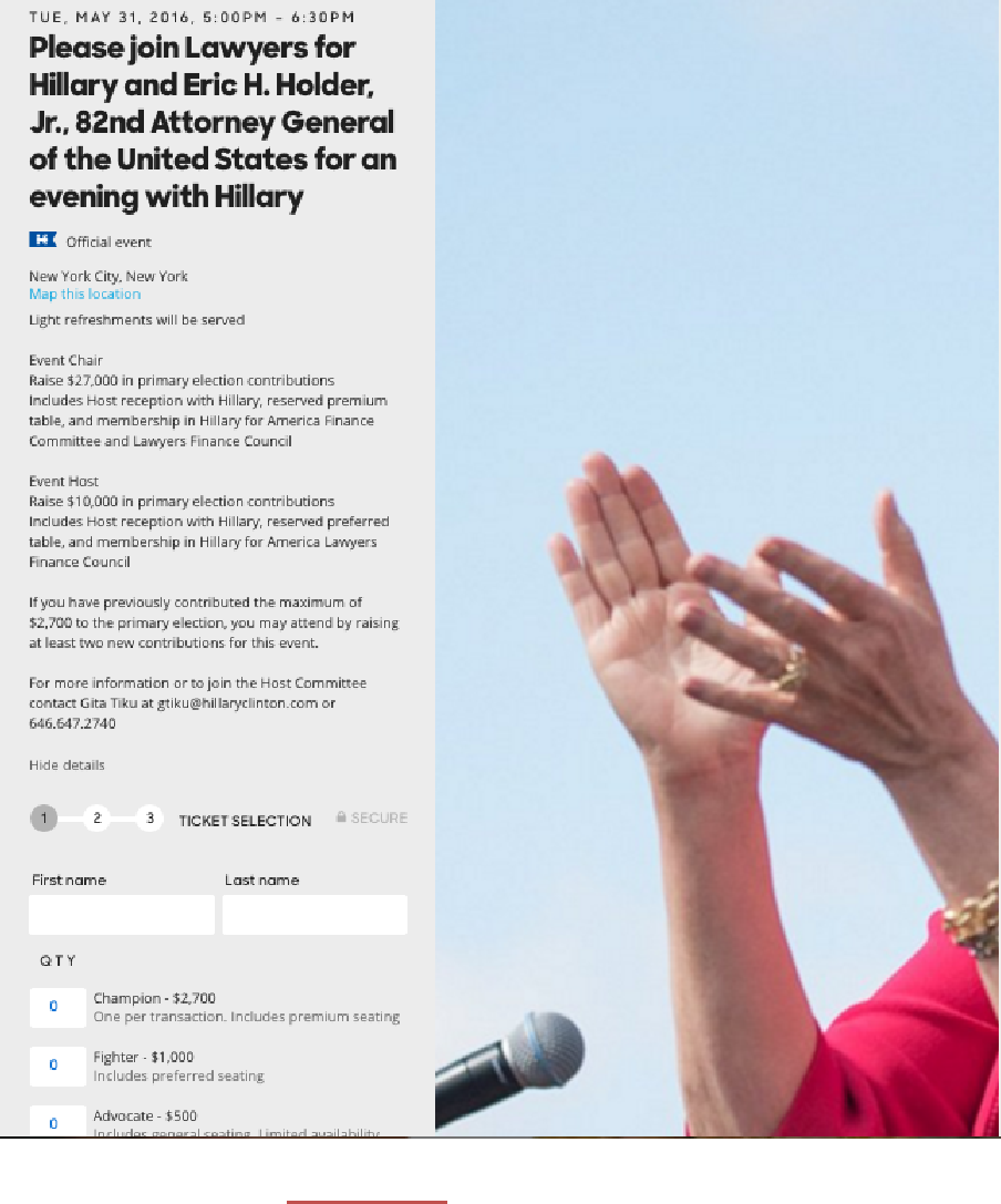 An invitation for the event posted on Hillaryclinton.com reads, “Please join Lawyers for Hillary and Eric H. Holder, Jr., 82nd Attorney General of the United States and Julianna Margulies for an evening with Hillary.”