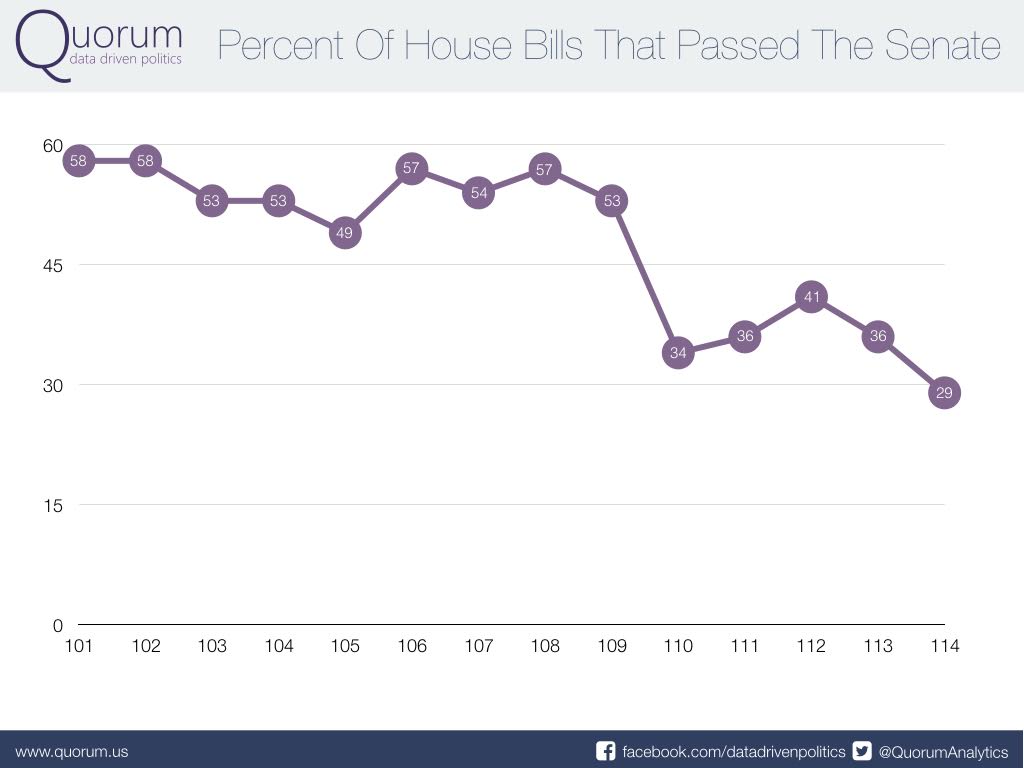 The online platform Quorum said the Senate of the Republican-controlled 114th Congress, which started in 2015 and ends next month, passed 29 percent of bills sent to it from the House. That is down from 36 percent from 2013 to 2015.