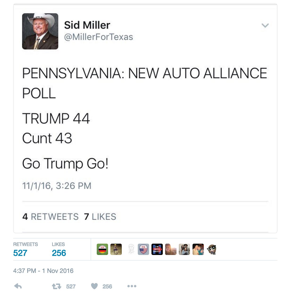 Earlier in the day, Miller tweeted messages touting Trump’s 1-point lead over Clinton, but he did not use offensive language against Clinton.
