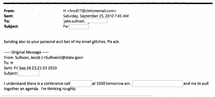 On September 24, 2010, Clinton aide and State Department staffer Jake Sullivan emailed Clinton at [email protected] regarding a conference call the following day. Although Clinton replied to Sullivan’s State Department email account, she also sent the following: