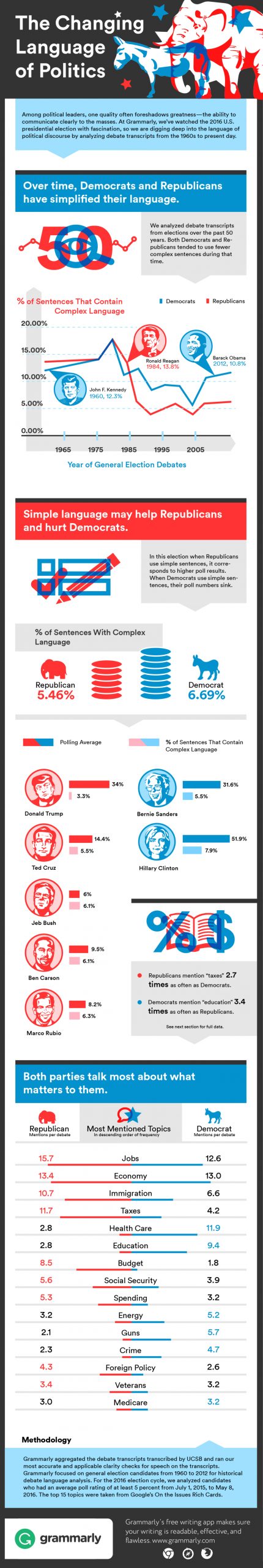 An examination of top candidates’ debate transcripts — part of a study published Tuesday by Grammarly titled “The Language of Politics” — finds that Donald Trump’s minimal use of “complex language” parallels his unmatched poll numbers among his now-defeated GOP rivals. Meanwhile, Democratic front-runner Hillary Clinton’s top-of-the-class use of complex language matches her strength in the polls over Bernie Sanders.