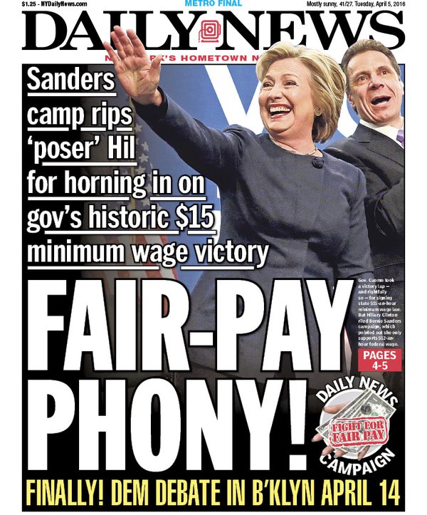 The unflattering Clinton headline is in reference to New York Gov. Andrew Cuomo signing a bill Monday increasing the state’s minimum wage rate to $15 an hour.