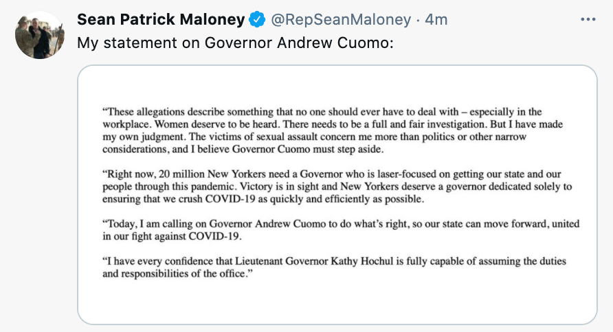 Carolyn Maloney, Grace Meng, Jerry Nadler, Alexandria Ocasio-Cortez, Joseph Morelle, Paul Tonko, Chris Jacobs, and Nydia Velazquez, all released statements calling on the embattled Democratic governor of their state to leave office. So did Sean Patrick Maloney, who is chairman of the House Democrats’ campaign arm.