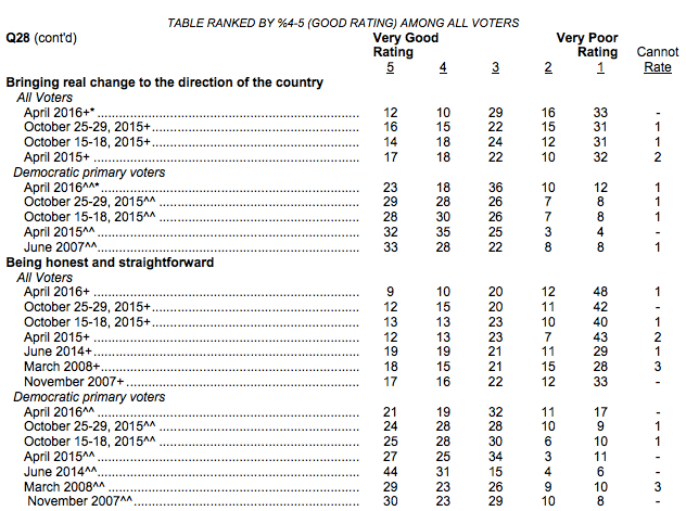 The NBC/WSJ survey has asked respondents since 2007 to rate Clinton’s honesty and straightforwardness on a scale of 1 to 5, with 1 being “very poor” and 5 being “very good”. Over that same period, the poll has gauged Hillary’s ability to bring “real change” to the United States. The trends are awful among registered voters and Democratic primary voters alike:
