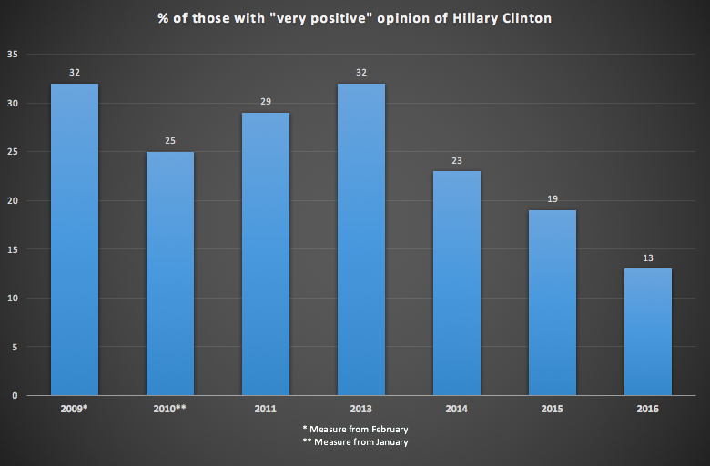 This measure of favorability has decreased 20 points the last three years. Overall, just 32 percent have a positive opinion of Clinton (very positive plus “somewhat positive”), down from a high of 59 percent in 2009. That combined statistic was regularly above 50 percent throughout her time at the State Department.