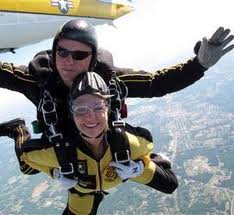 Willing to try new adventures, last week saw Mrs. McDonnell and daughter Cailin skydiving from an airplane with the U.S. Army’s Golden Knights Parachute Team, a public show of support for military families everywhere. I don’t know if she had every jumped from a plane before — the photo taken in mid-air is of her with a big smile on her face — but that took guts. A photo of her landing sparked a light-hearted “name the caption” contest at the Bearing Drift blog.