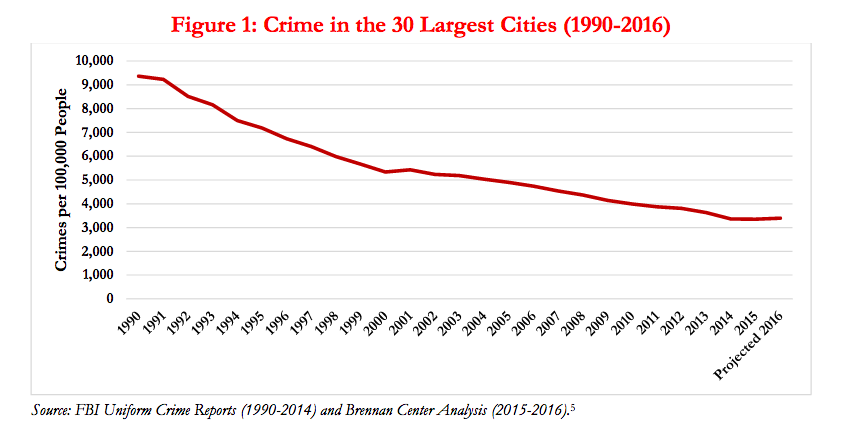 “These findings undercut media reports referring to crime as ‘out of control,’ or heralding a new nationwide crime wave,” said the report, authored by researchers Matthew Friedman, Ames Grawert and James Cullen.