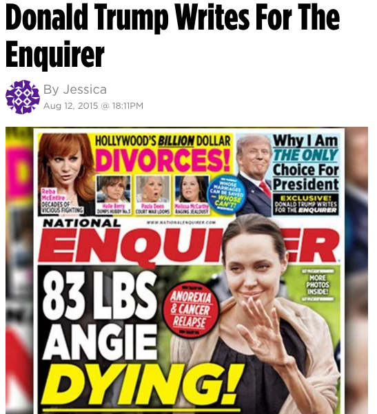 Last summer and fall, Trump wrote a series of largely self-serving pieces for the Enquirer trumpeting his qualifications for the presidency. The articles appeared under the heading “Donald Trump Writes For The Enquirer” and similar headlines: