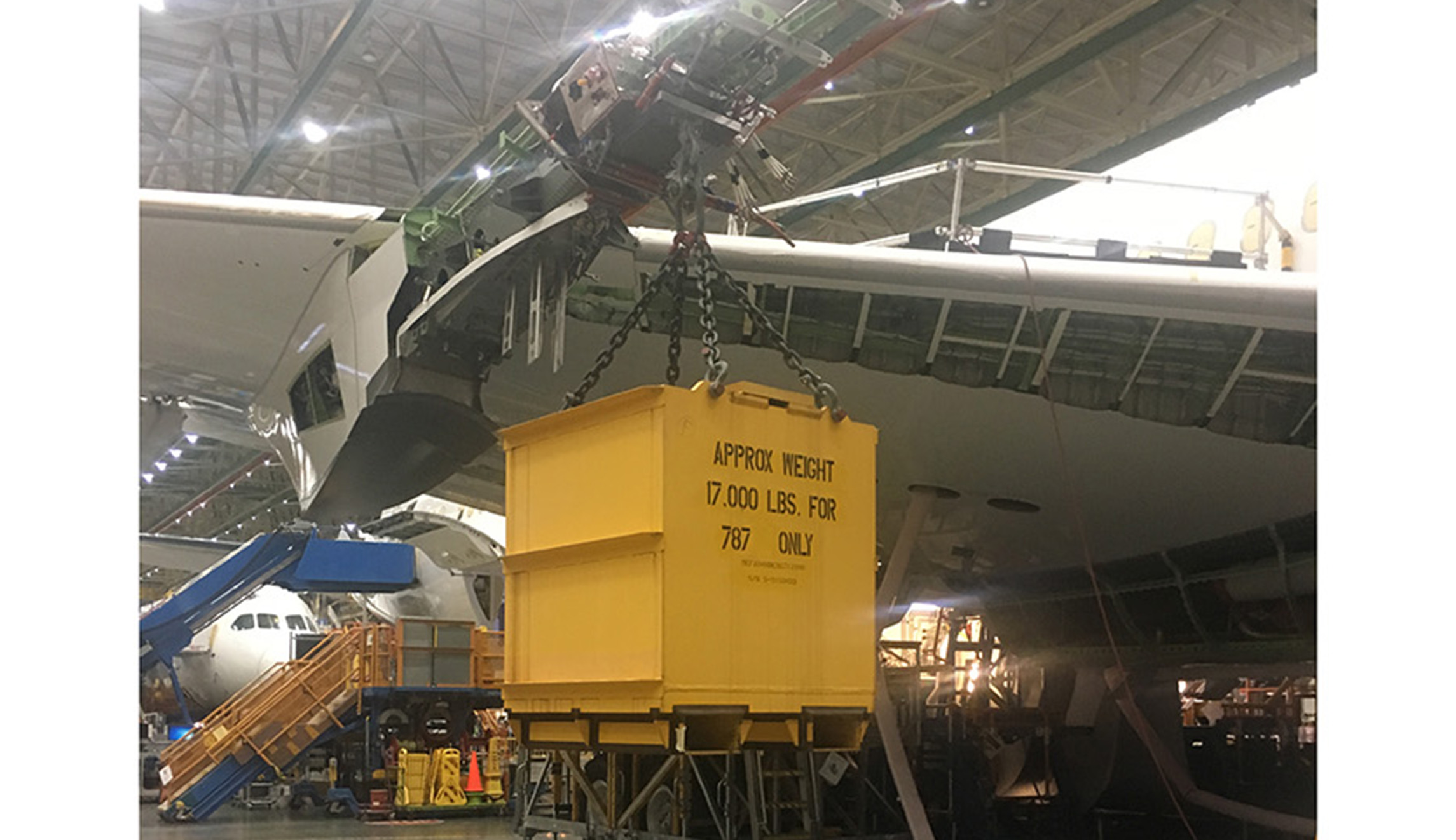 This one is almost done. One major item left, though, is to attach the jet engines to its wings. For now, instead of engines, it has 17,000-pound weights attached to the wings to prevent it from tipping.