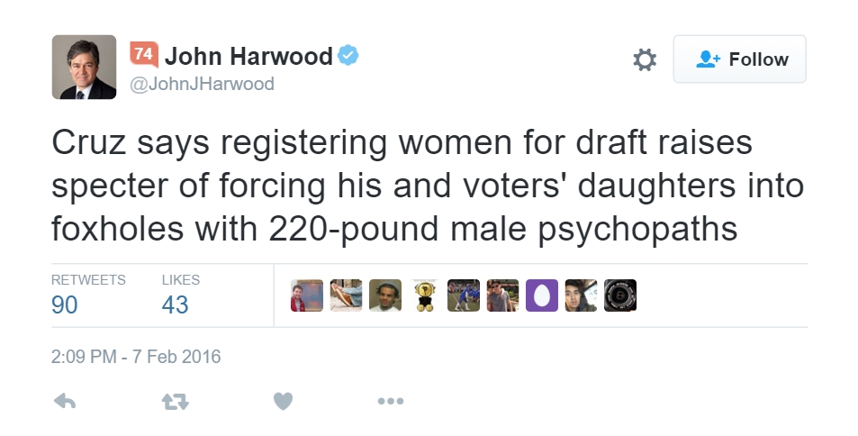 “Cruz says registering women for draft raises specter of forcing his and voters’ daughters in foxholes with 220-pound male psychopaths,” Harwood, who was in the room when Cruz was speaking, wrote in a tweet.