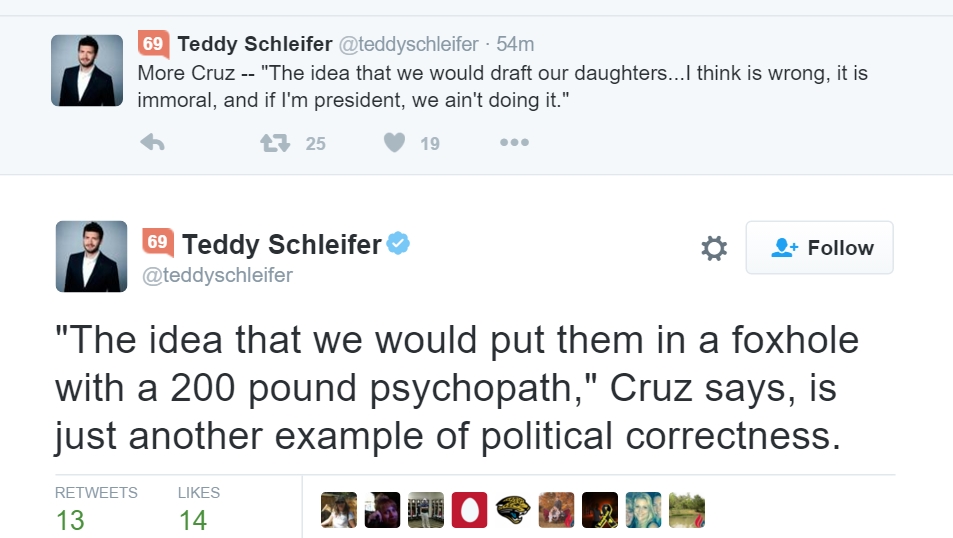 “More Cruz – ‘The idea that we would draft our daughters…I think is wrong, it is immoral, and if I’m president, we ain’t doing it,'” he added. “‘The idea that we would put them in a foxhole with a 200 pound psychopath,” Cruz says, is just another example of political correctness.”