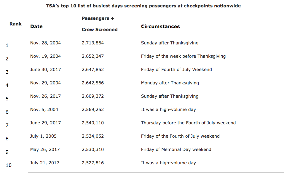 “Typically, an average travel day would see TSA screen in the neighborhood of 2.1 million passengers and crew, but in the busiest days of the Thanksgiving travel week, TSA screened as many as a half million more passengers per day than usual.”