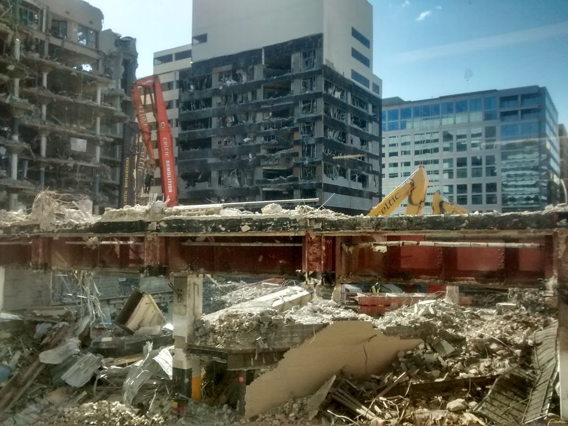 Baseball’s not the only diversion we have at TWS. We moved offices recently, as you may know, and now have the pleasure of watching the destruction of the old Washington Post building next door. It’s a pretty spectacular sight (though the all-day noise of concrete walls being assaulted and bashed can be a bit wearing), and we spend a fair amount of time indulging our inner 5-year-old by looking out of our windows as, a mere 20 feet or so away, huge machines do their destructive things. I’ve asked Deputy Online Editor Jim Swift to insert here a couple of photos he’s taken of the demolition so you get a sense of the scale.