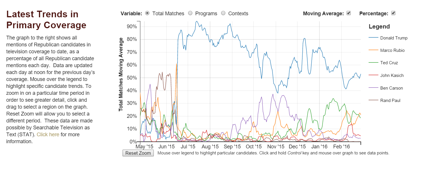 The casino tycoon has enjoyed eight straight months of unbroken coverage, and has easily outpaced all of his opponents, both Democratic and Republican, in terms of media mentions and panel discussions.