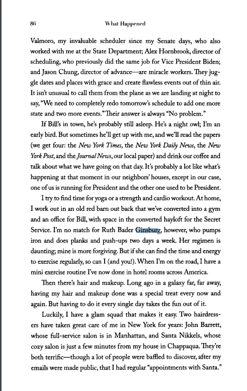 “I’m no match for Ruth Bader Ginsburg, however, who pumps iron and does planks and push-ups two days a week,” Clinton writes on page 86. “Her regimen is daunting, mine is more forgiving. But if she can find the time and energy to exercise regularly, so can I (and you!). When I’m on the road, I have a mini exercise routine I’ve now done in hotel rooms across America.”