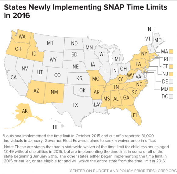 Many states have been able to qualify for statewide waivers to suspend the three-month limit. But this year, 23 new states, including New Jersey, North Carolina, Georgia and Florida, will have the benefit limit back in effect for the first time since before the Great Recession because of decreasing statewide unemployment levels unless the specific adults in the demographic work at least 20 hours per week.