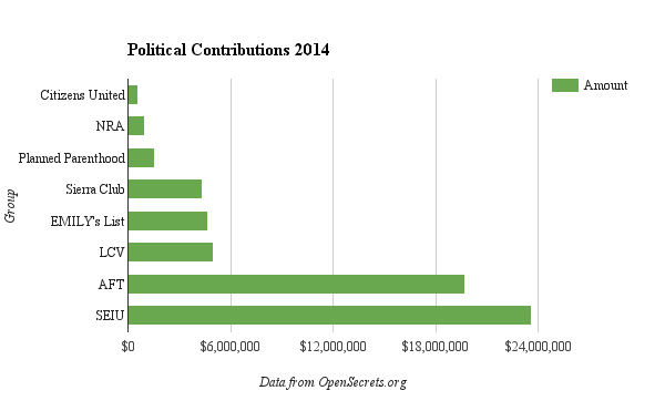The American Federation of Teachers contributed $19 million to candidates and PACs last year, while the Service Employees International Union, which has endorsed Clinton, spent more than $23 million on political contributions.