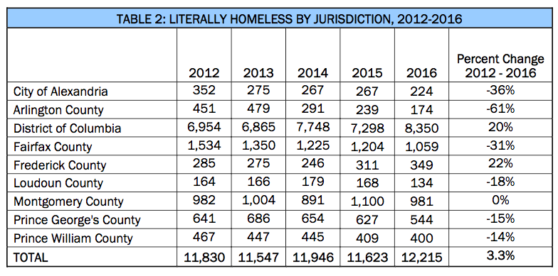 The District of Columbia and Frederick County were the only two jurisdictions with increases in the number of people experiencing homelessness from 2015 to 2016, the report found.
