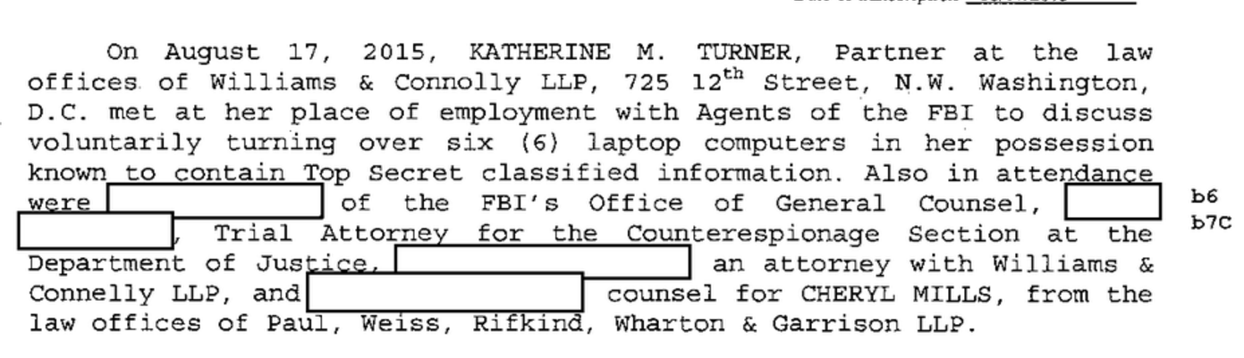 Katherine Turner, an attorney at the law firm representing Clinton, told FBI agents in August of last year that she had obtained six laptops from Clinton’s staff, each of which likely contained “Top Secret classified information.”