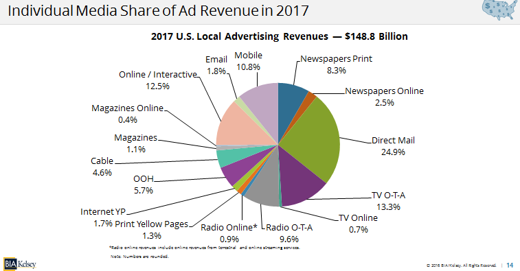 “A large part of that is because of a decline in revenue going to print media, including newspapers, magazines and direct mail,” said Mark Fratrik, senior VP-chief economist at BIA/Kelsey.