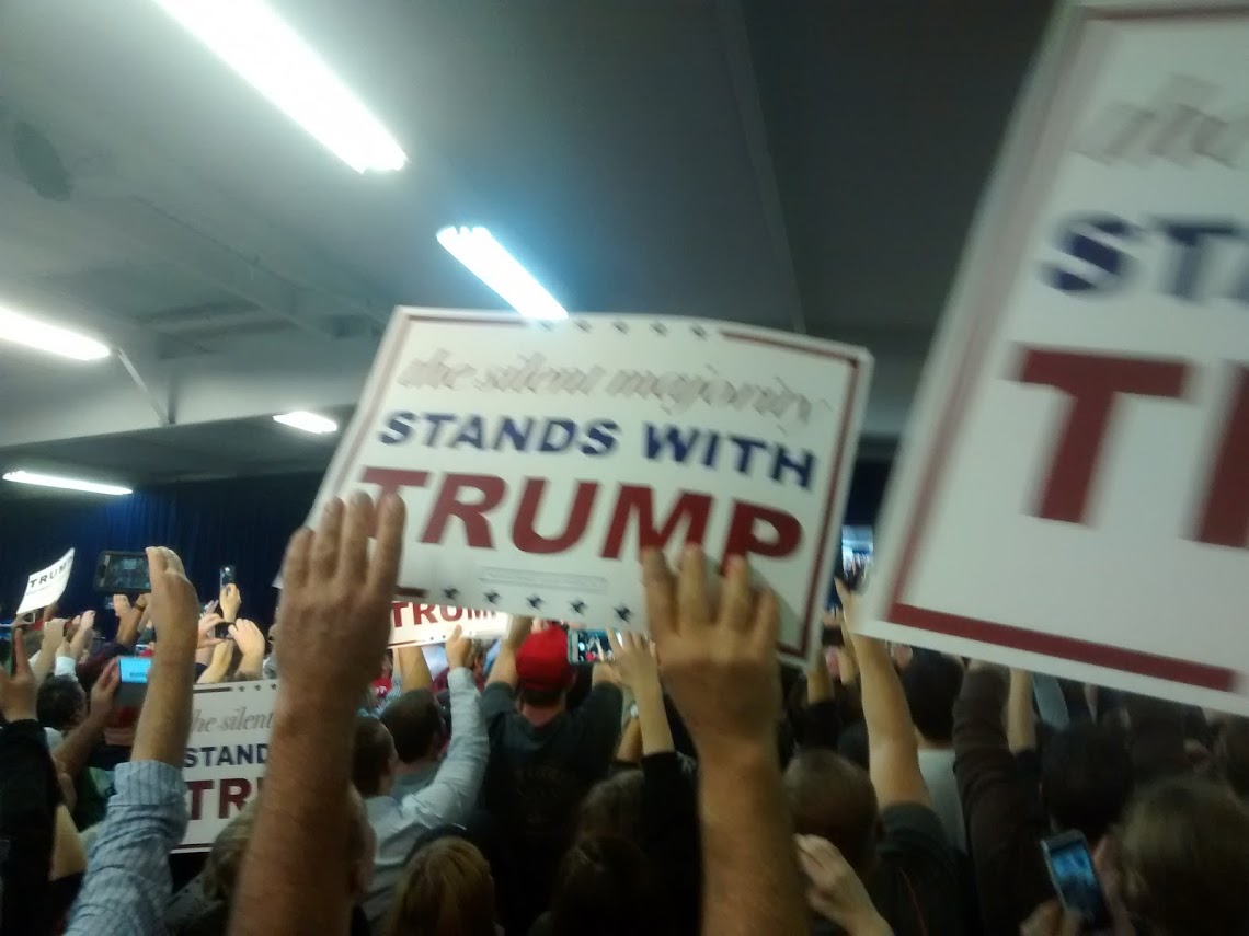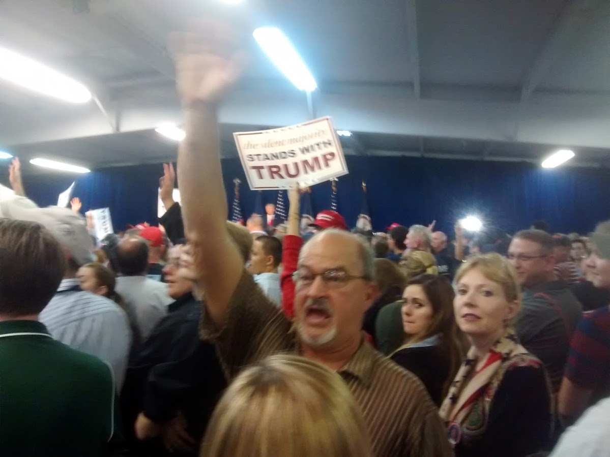 This was not a ‘YUUUGE’ rally like ones in recent memory, but as Trump later joked when chiding his opponents for their comparatively smaller rallies, it was no small feat. In total, about 1,000 or so Trump supporters crowded into a modern steel barn at the fairgrounds. The crowd, like most GOP rallies, skewed mostly white and older — but there were also a fair amount of minorities and teenagers in attendance.