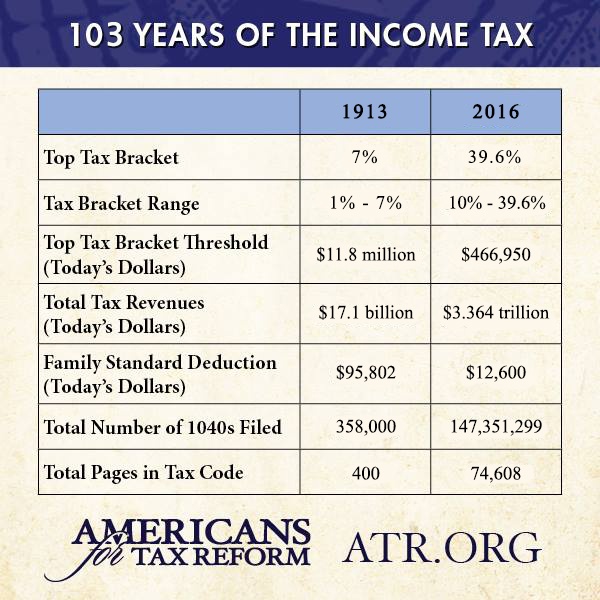A graphic shows that income tax brackets once ranged from 1% – 7%, but now range from 10% – 39.6%. The tax code itself has grown from 400 pages to 74,608 pages.