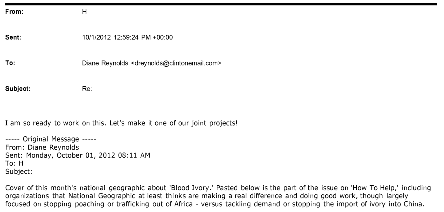 Hillary wasn’t kidding. Just a little more than a month after the email exchange, the secretary hosted an event at the State Department entitled “Wildlife Trafficking and Conservation: A Call to Action.” The event was attended by foreign ambassadors and officials from international conservation organizations, as well as interested parties from the private sector.