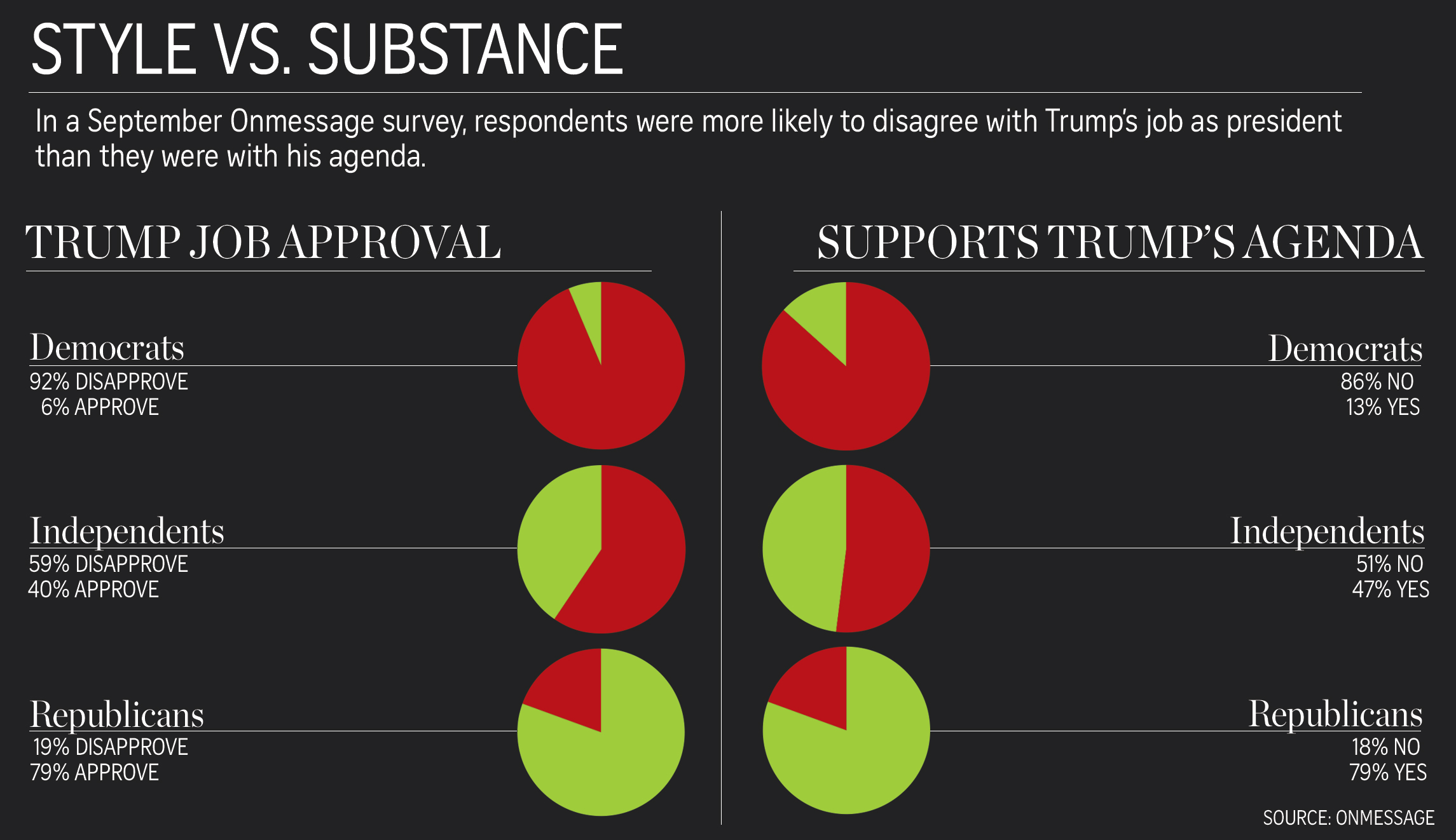 For independents in particular, more respondents approve of Trump’s agenda than approve of his job performance. They’re sympathetic to what Trump is trying to do — they actually support what he is trying to do — but they are uncomfortable with how he is going about it.