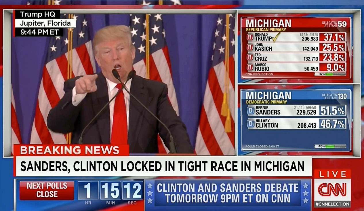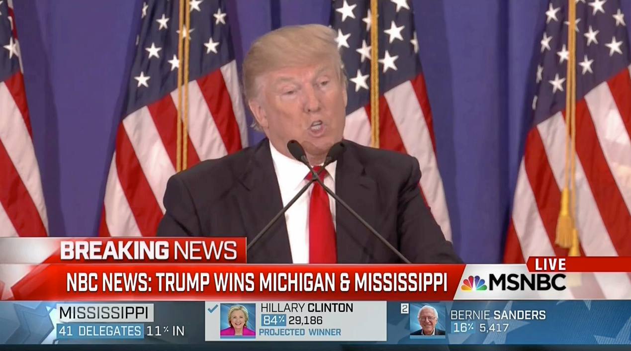 By the time Trump exited the stage Tuesday evening, he had been declared the winner in GOP election battles in Michigan and Mississippi. Clinton meanwhile declared victory in Mississippi, marking her latest triumph over Sen. Bernie Sanders, I-Vt.