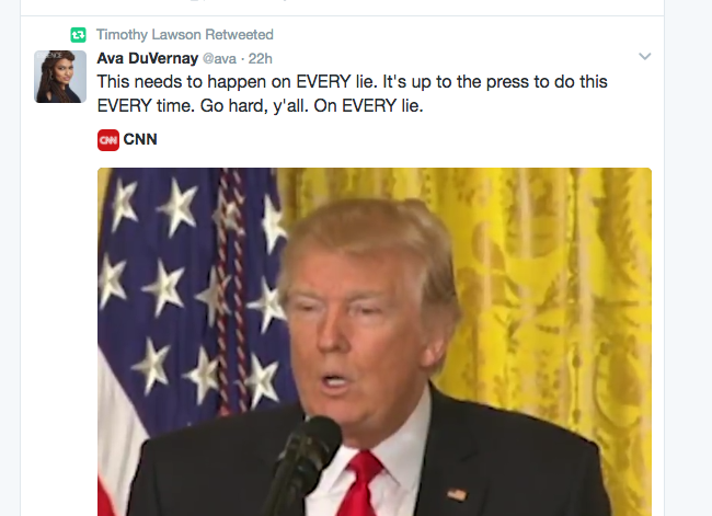 Also this week, Lawson retweeted a tweet from someone who wrote about an interaction between Trump and an aggressive reporter on Thursday, “This needs to happen on EVERY lie. It’s up to the press to do this EVERY time. Go hard, y’all. On EVERY lie.”