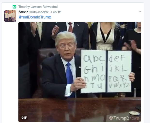 Lawson has retweeted other tweets making fun of Trump. He retweeted a video that was doctored to appear as if Trump just wrote the alphabet and showed it off to applause in the White House.