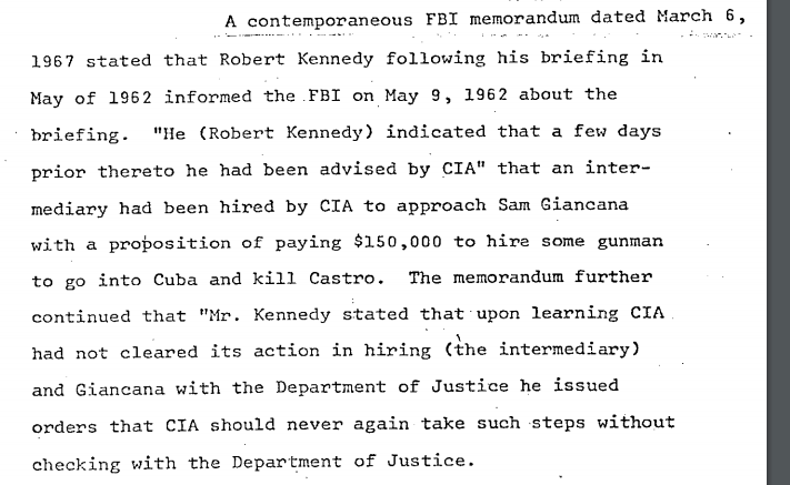 “‘He (Robert Kennedy) indicated that a few days prior thereto he had been advices by CIA’ that an intermediary had been hired by CIA to approach Sam Giancana with a proposition of paying $150,000 to hire some gunman to go into Cuba and kill Castro,” the memo said.