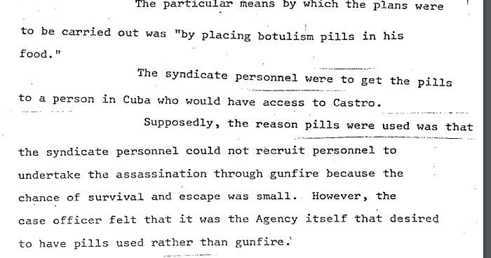“Supposedly, the reason pills were used was that the syndicate personnel could not recruit personnel to undertake the assassination through gunfire because the chance of survival and escape was small,” it said. “However, the case officer felt that it was the Agency itself that desired to have pills used rather than gunfire.”