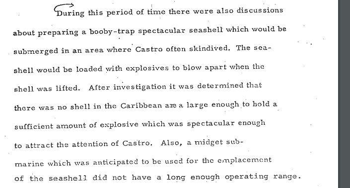 “The seashell would be loaded with explosives to blow apart when the shell was lifted,” it said. “After investigation it was determined that there was no shell in the Caribbean area large enough to hold a sufficient amount of explosive which was spectacular enough to attract the attention of Castro.”