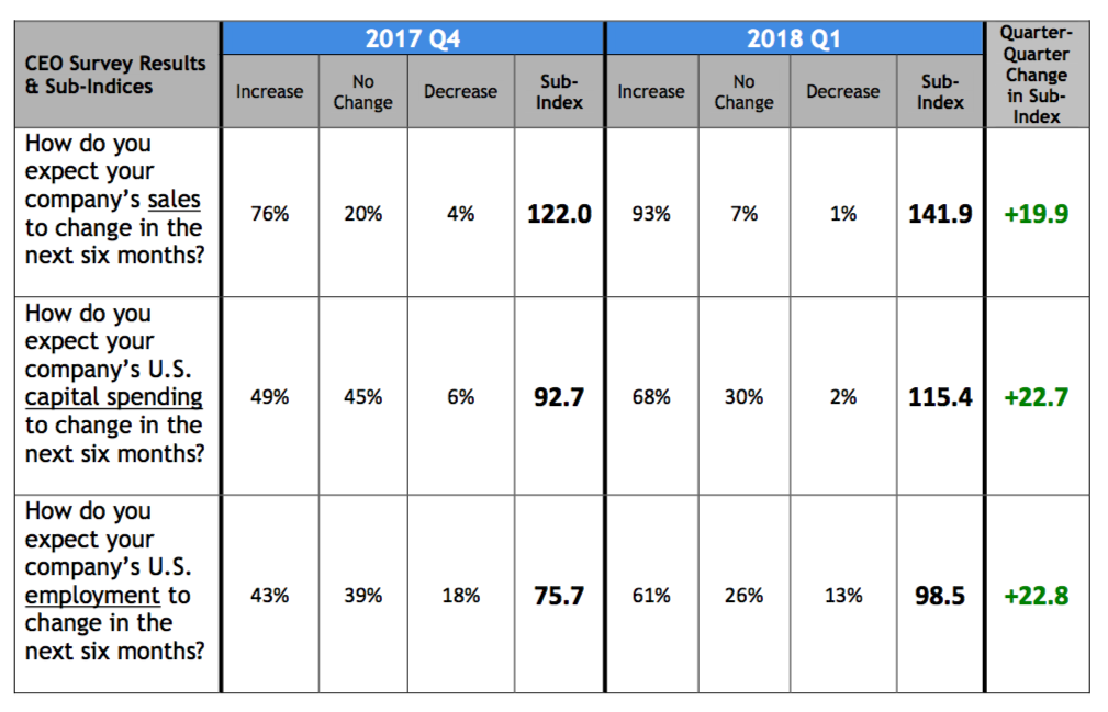 The questionnaires, which measure plans for hiring, capital investment and sales, feed the Washington-based organization’s CEO Economic Outlook Index, which increased to 118.6 in the first three months of 2018, the highest since it began in 2002. Index readings range from -50 to 150, with any reading below 50 indicating the economy is contracting. Sub-indexes for sales, capital spending and hiring climbed to 141.9, 115.4 and 98.5, respectively.